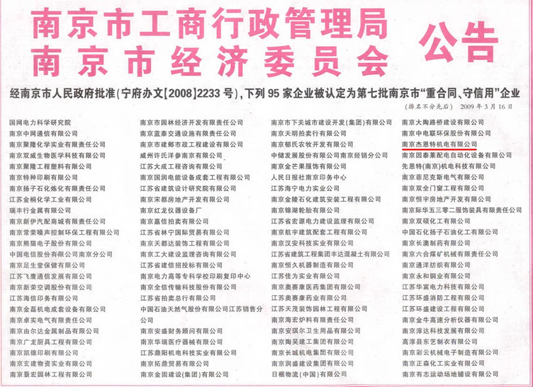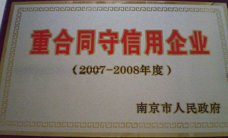 經南京市人民政府批準(寧府辦文【2008】2233號),南京杰恩特機電有限公司被認定為第七批南京市“重合同守信用企業”之一!