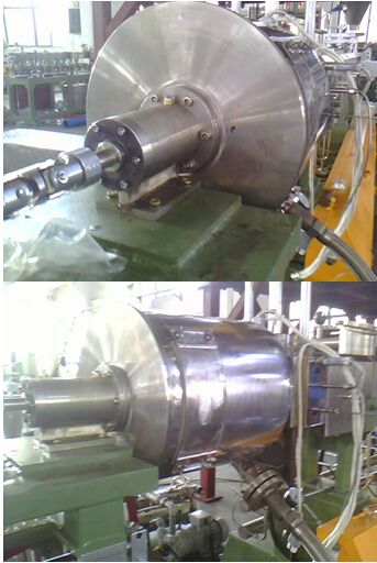 該新型水環熱切粒機的切刀盤與切刀座球型連接,能保證幾把切刀同時與機頭模板密貼,切粒效果好,軸承座設在切粒罩外部,防止軸承座因高溫而損壞,軸承座內設油封和氣密裝置,能夠有效的阻隔水分和腐蝕氣體進入軸承,進一步提高了軸承座的使用壽命,軸承座采用特殊結構設計,增加了刀桿的剛性,使刀桿在轉動時無跳動現象。該新型設計已申請專利。